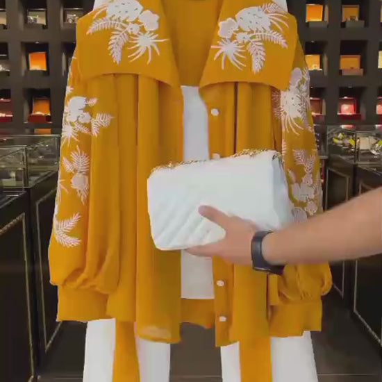 Designed in a rich mustard color, this western-inspired maxi is perfect for weddings, parties, and formal gatherings. The embroidered details add a luxurious charm, while the lightweight chiffon fabric ensures comfort. Available in medium size, it combines sophistication with ease, making it a wardrobe essential for every stylish woman.