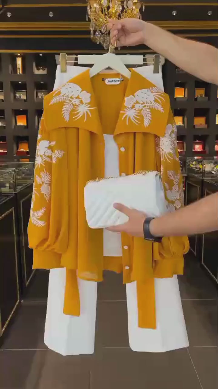 Turn heads with this Women’s 3-Piece Mustard Embroidered Chiffon Maxi Set, crafted for elegance and style. This outfit includes an embroidered chiffon upper, a soft inner, and a matching belt, giving you a graceful and modern party wear look.